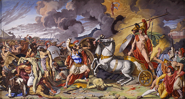 «¡Troyanos, licios y dárdanos, que lucháis cuerpo a cuerpo! ¡Sed hombres, amigos, y recordad vuestro impetuoso coraje! Se ha ido el hombre más bravo, y a mí me ha dado inmenso honor Zeus Crónica. Guiad rectos los solípedos caballos contra los valientes dánaos y ganaréis un honor aún superior».